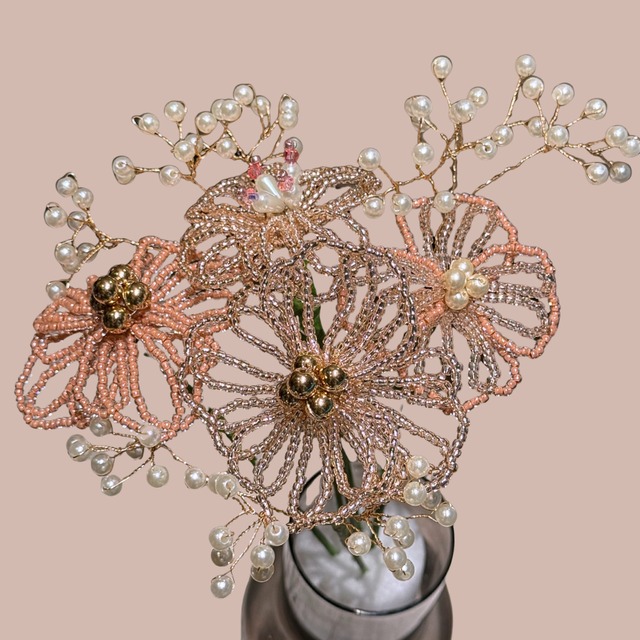 【内容】 ・お花 4本 ・パールフラワー 3本 【素材】 ガラスビーズ / ワイヤー / 紙テープ / パールビーズ 【配送について】 ・決済完了から2~4営業日以内に発送いたします。 【商品に関する注意事項】 ⚪︎個体差似ついて ハンドメイド作品のため、ビーズの配置・花の形・サイズ・色味などにわずかな個体差が生じる場合がございます。 作品の個性としてお楽しみいただけますと幸いです。 ⚪︎ ガラス素材について ガラスビーズは落下や強い衝撃により、割れ・欠けが生じる場合がございます。 お取り扱いは優しくお願いいたします。 ⚪︎ ワイヤーの曲げ伸ばしについて ワイヤー部分は何度も大きく曲げ直すと、金属疲労により折れの原因となります。 形を整える場合は、少しずつ丁寧に調整してください。 ⚪︎ 水濡れ・湿気に注意 水に濡れるとワイヤーが錆びたり、接着部分が弱くなる場合がございます。 水回りや湿気の多い場所での保管はお避けください。 ⚪︎直射日光を避けて保管 長時間直射日光に当たると、ワイヤーやビーズの変色・退色が起きる可能性がございます。 日の当たらない場所での保管をおすすめいたします。 ⚪︎お子様・ペットの手が届かない場所で 小さなビーズを使用しているため、小さなお子様やペットがいらっしゃる空間でご使用になる際は、誤飲防止のため高い場所での保管をお願いいたします。 ⚪︎お手入れについて お手入れは、柔らかい布や筆で軽くほこりを払う程度にしてください。 水拭き・洗剤のご使用はお控えください。