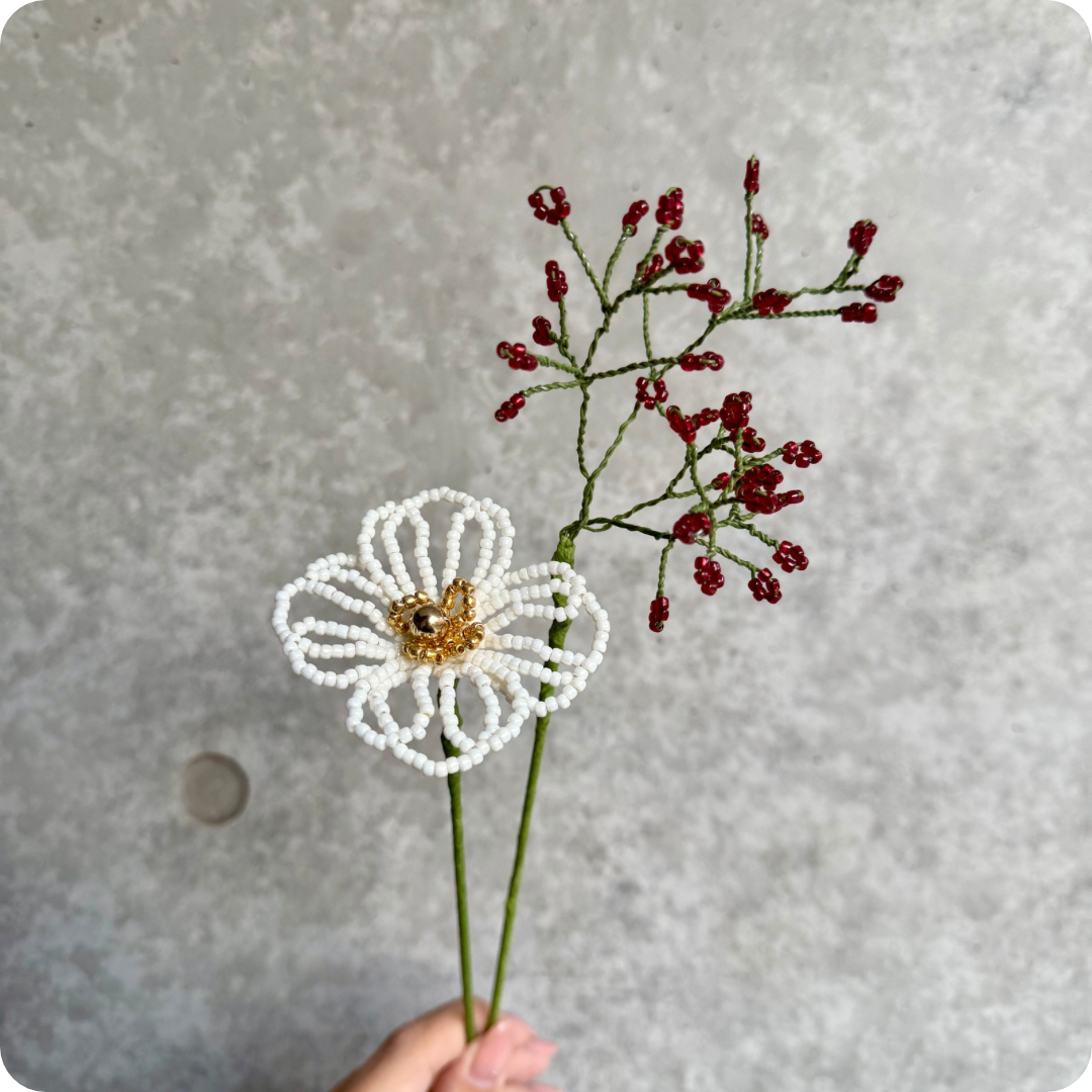 ハンドメイド作品のため、ビーズの配置・花の形・サイズ・色味などにわずかな個体差が生じる場合がございます。